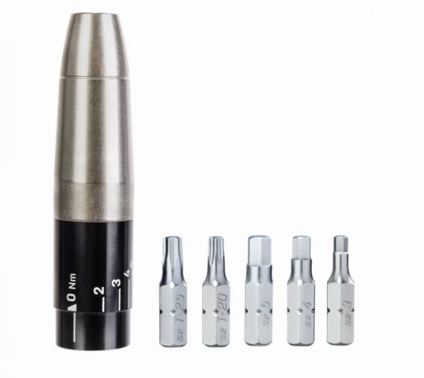 Kompakte, leicht ablesbare Drehmomenthülse, die aus jedem Mini-Tool mit 5 mm Inbus®- Schlüssel einen vollwertigen Drehmomentschlüssel macht. Der verstellbare Einstellbereich von 2 – 6 Nm garantiert stets das richtige Drehmoment für die meisten Schraubverbindungen von empfindlichen Anbau- und teuren Carbonteilen.